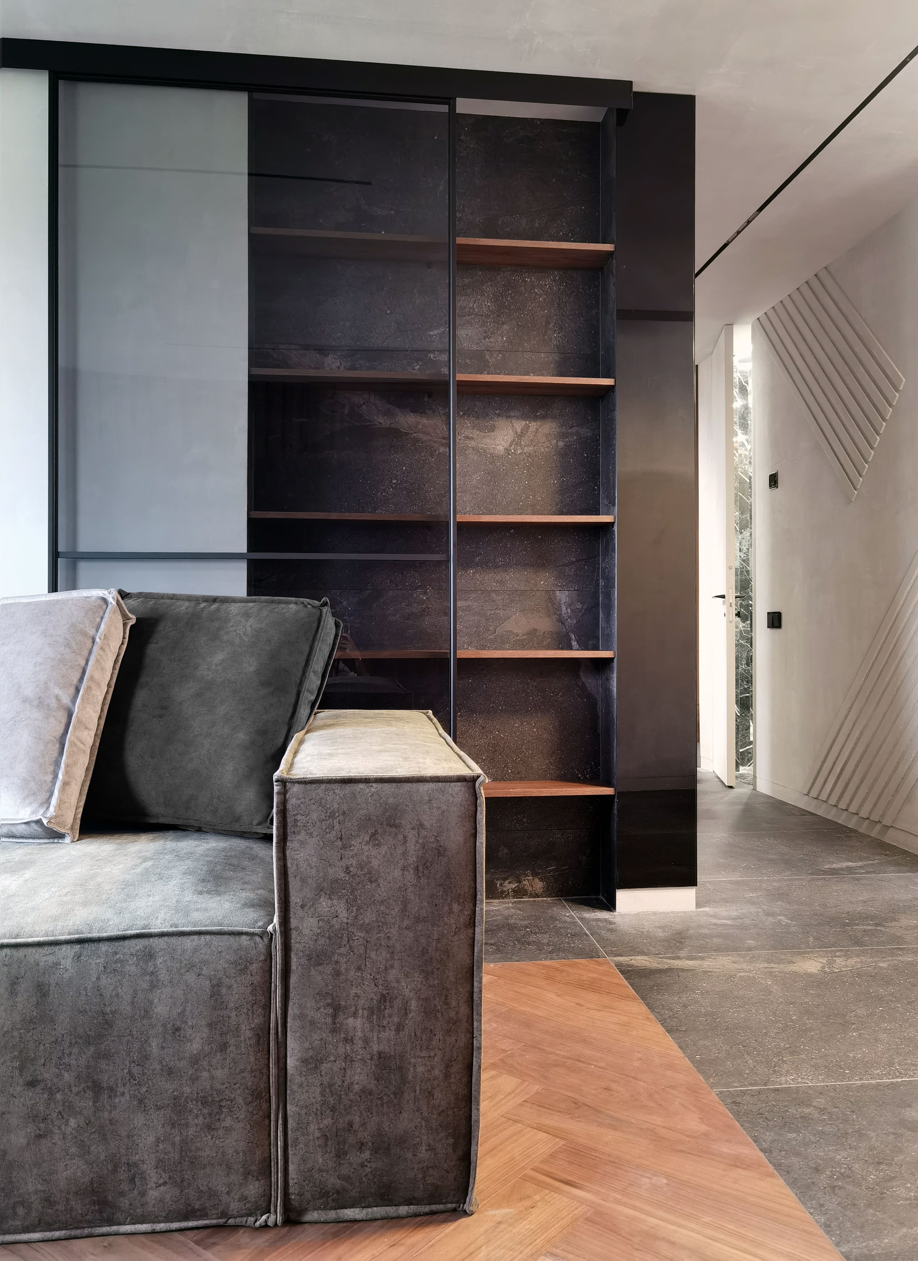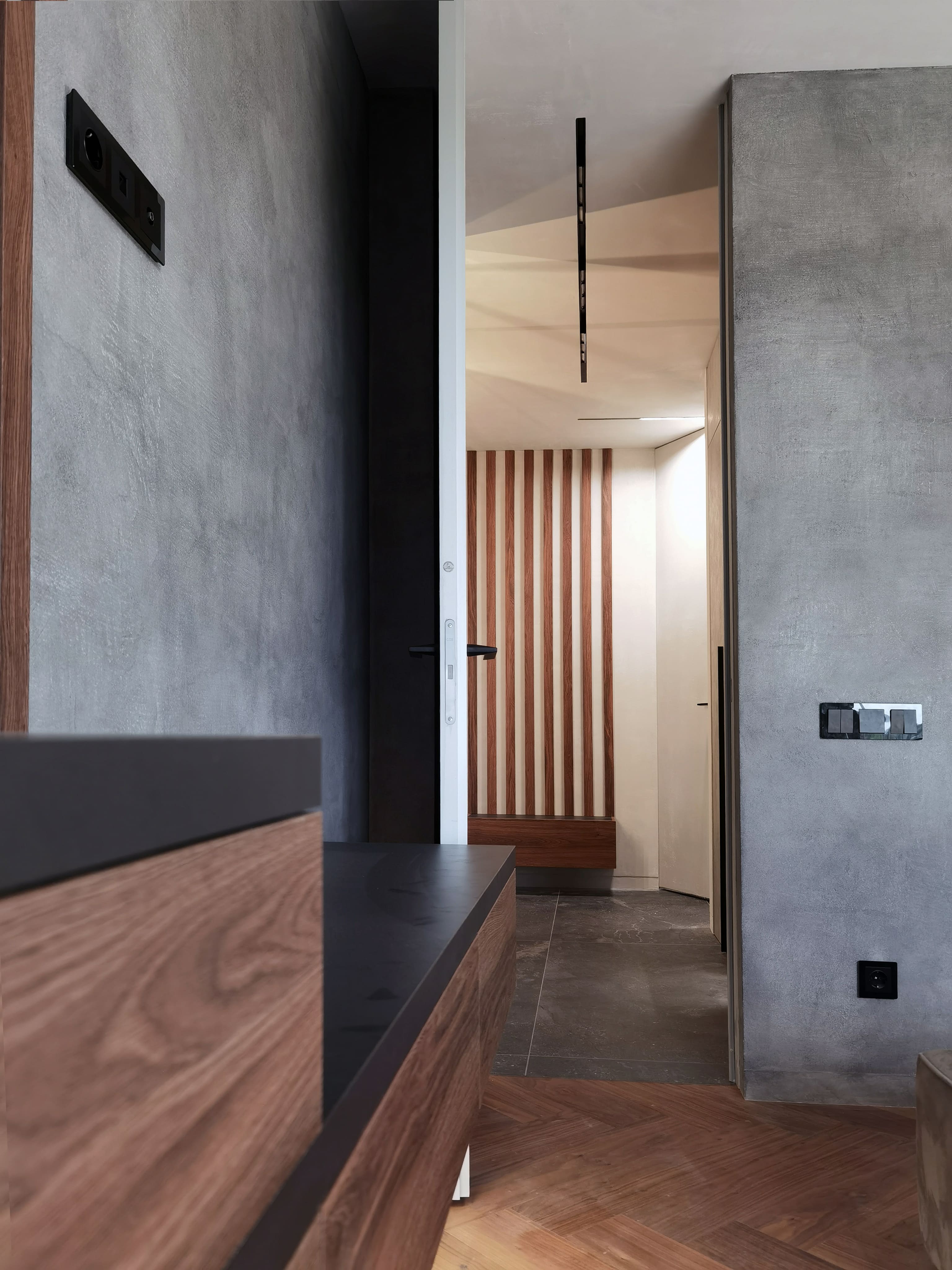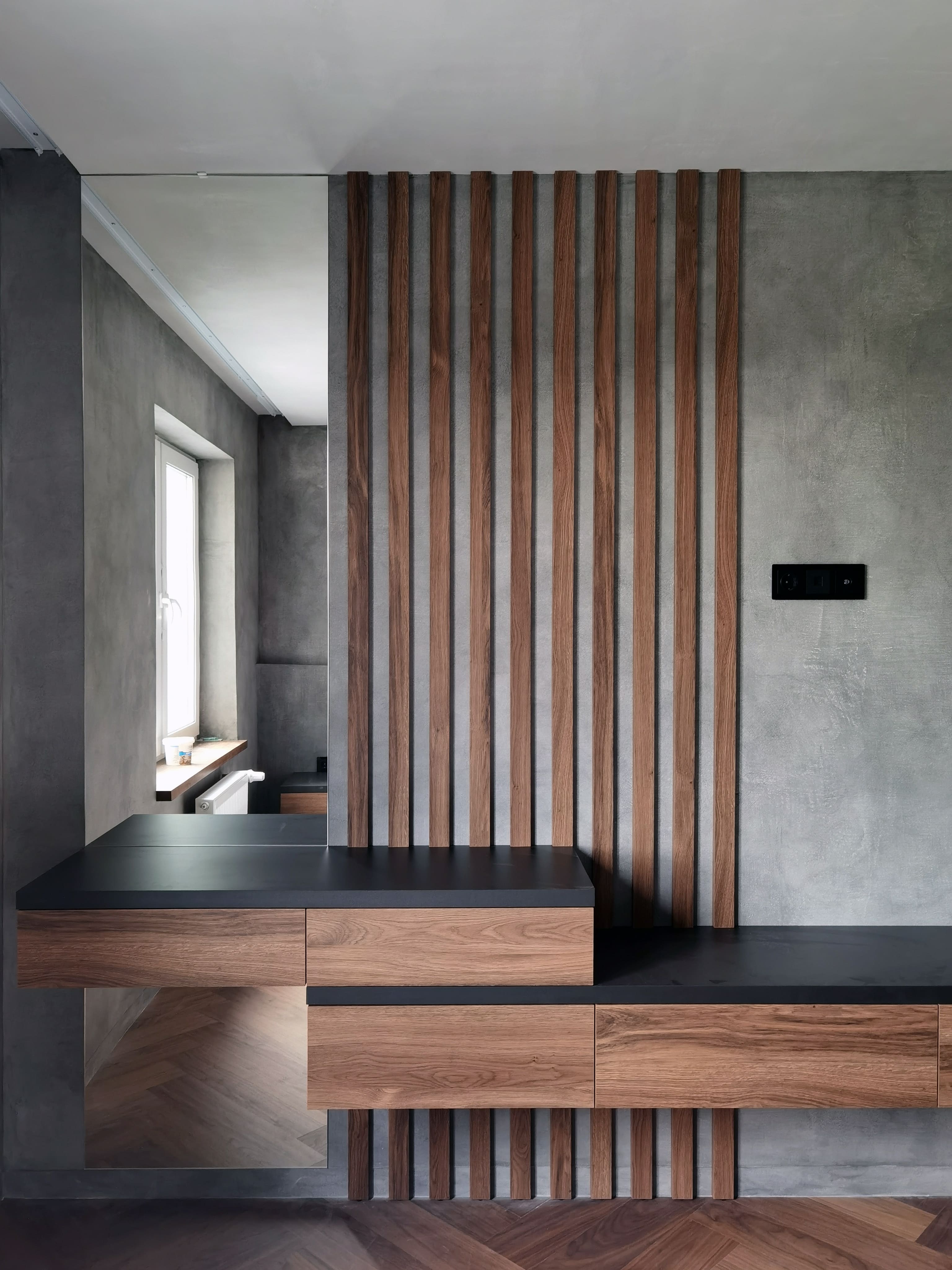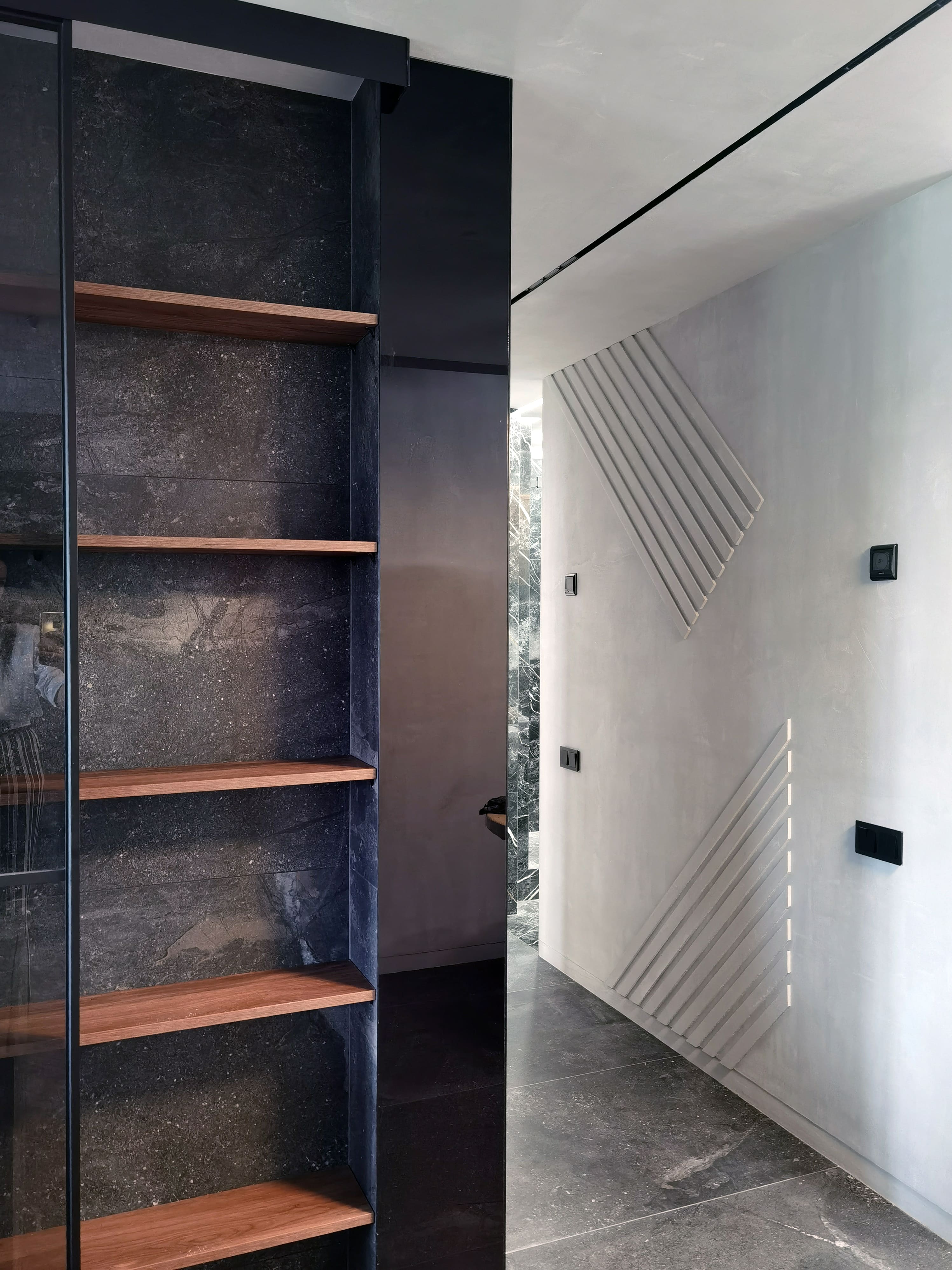 Realization of brutal apartement decorated with stones and dark wood for young bachelor