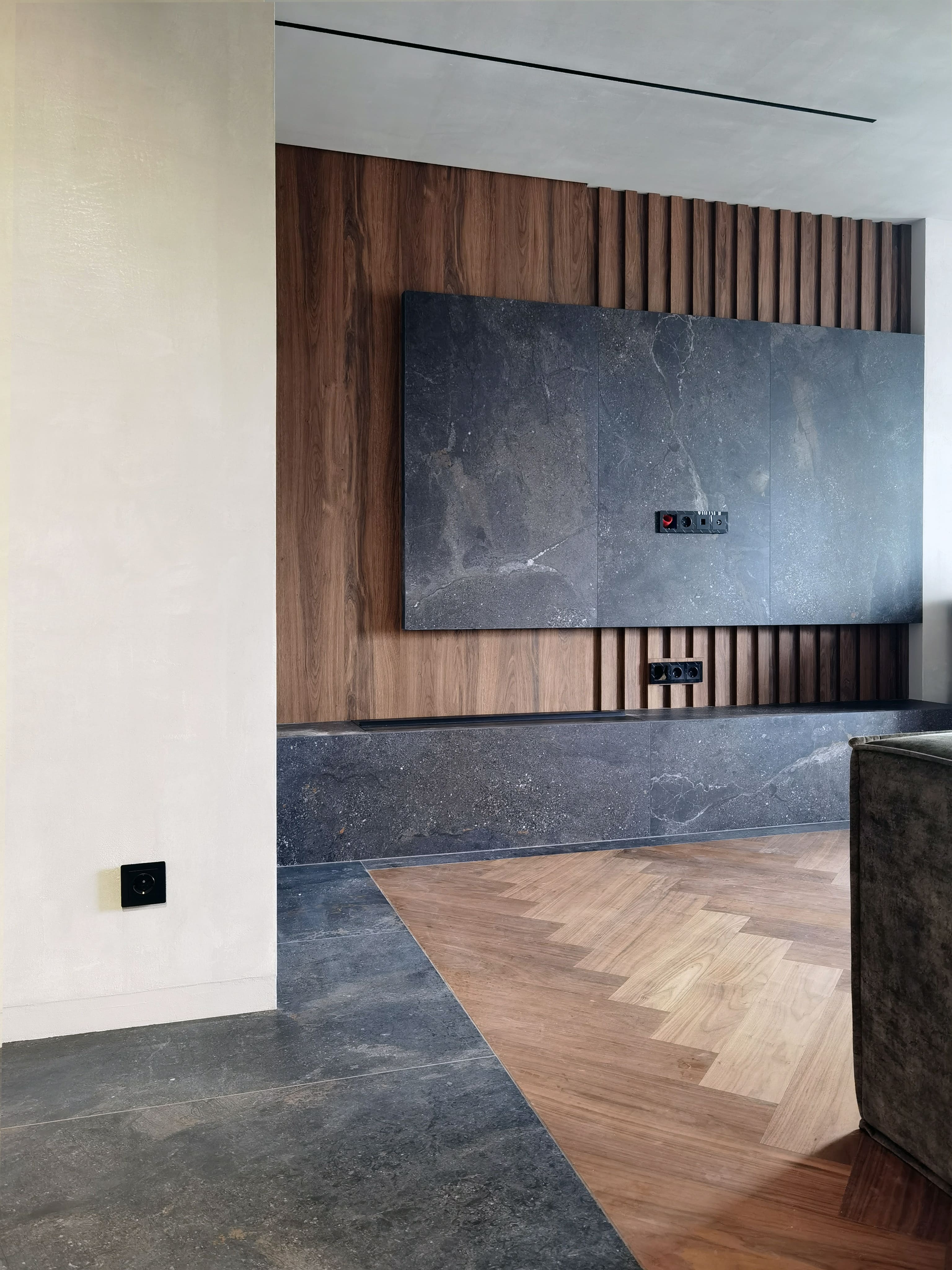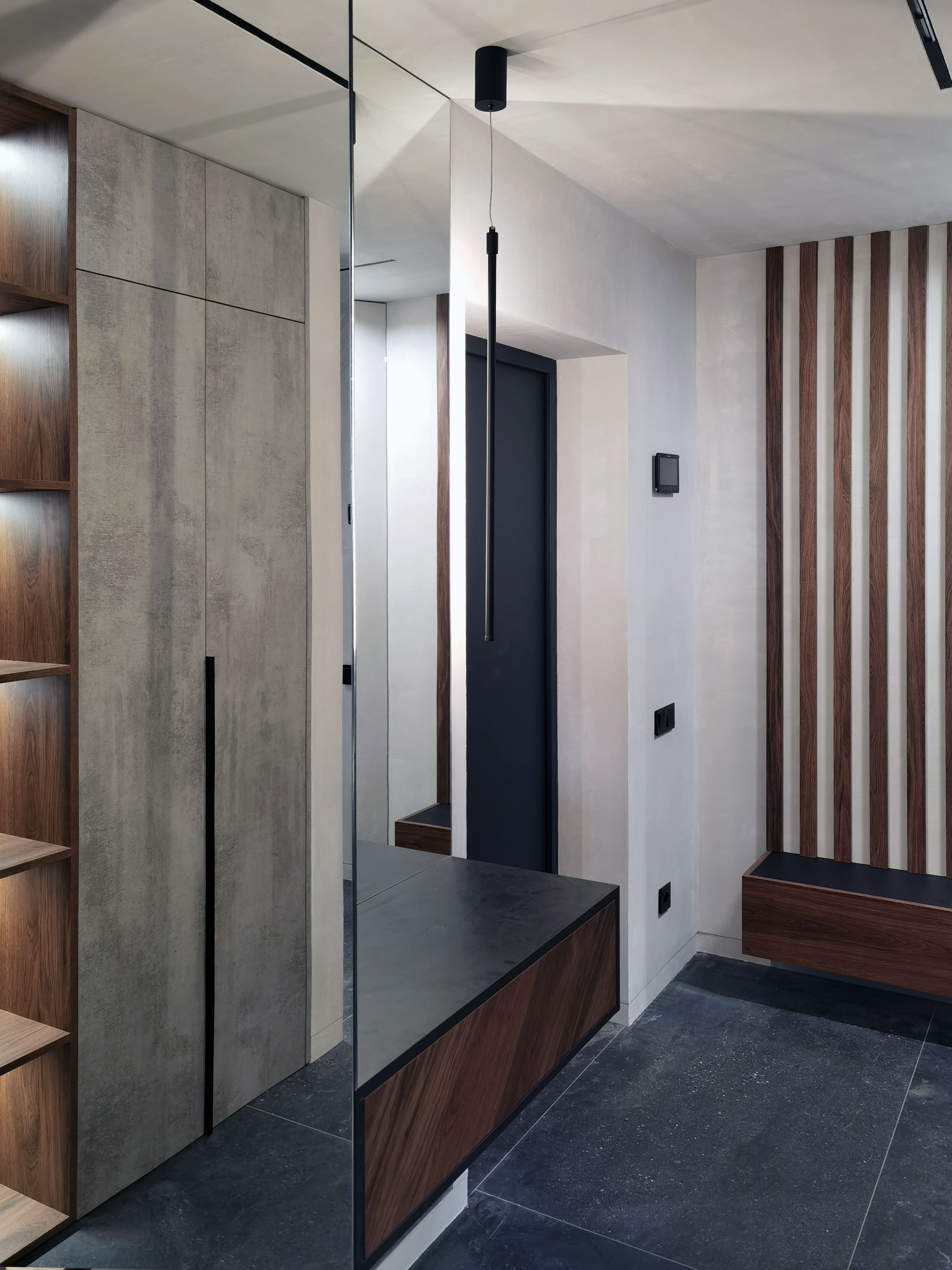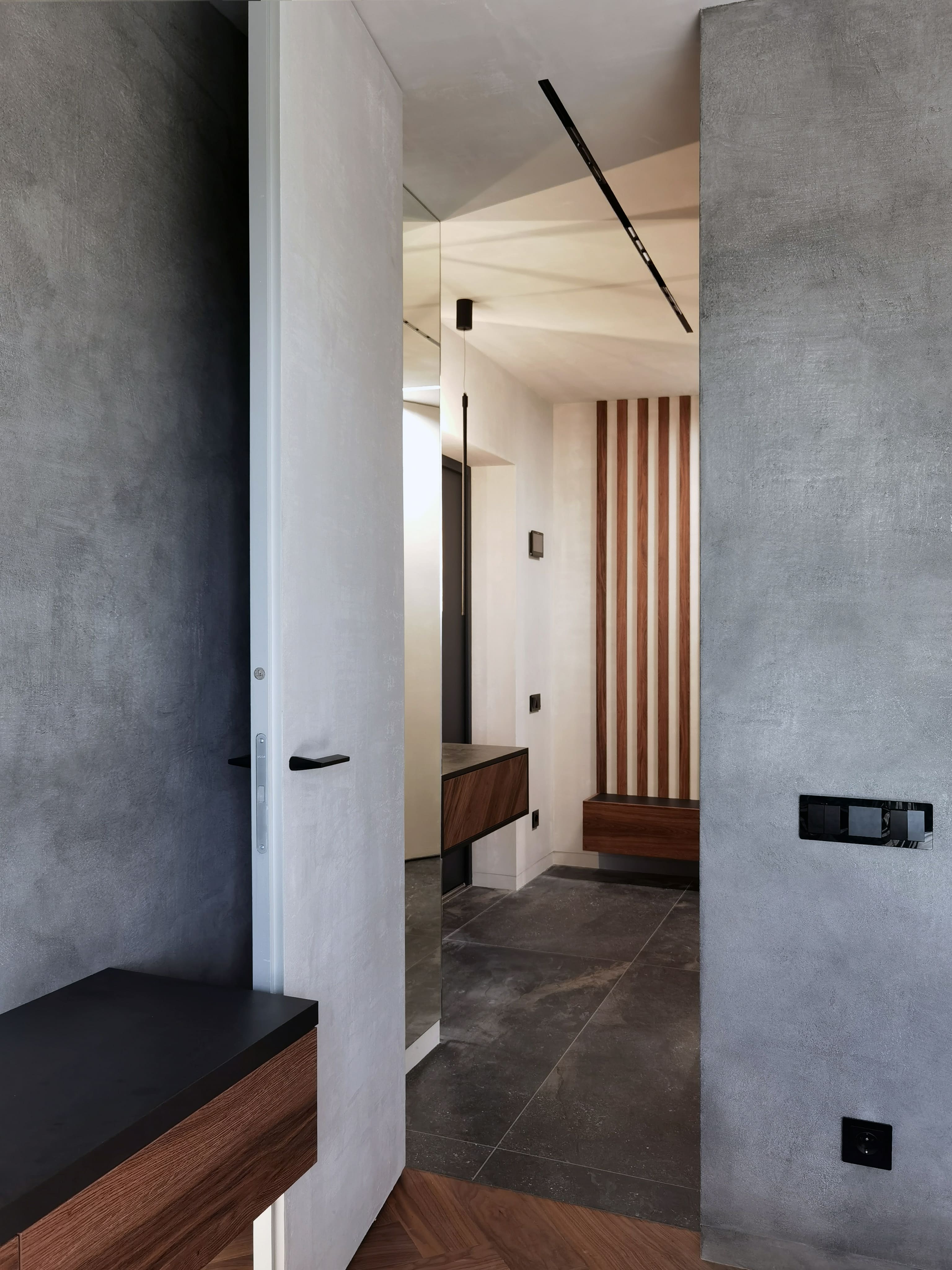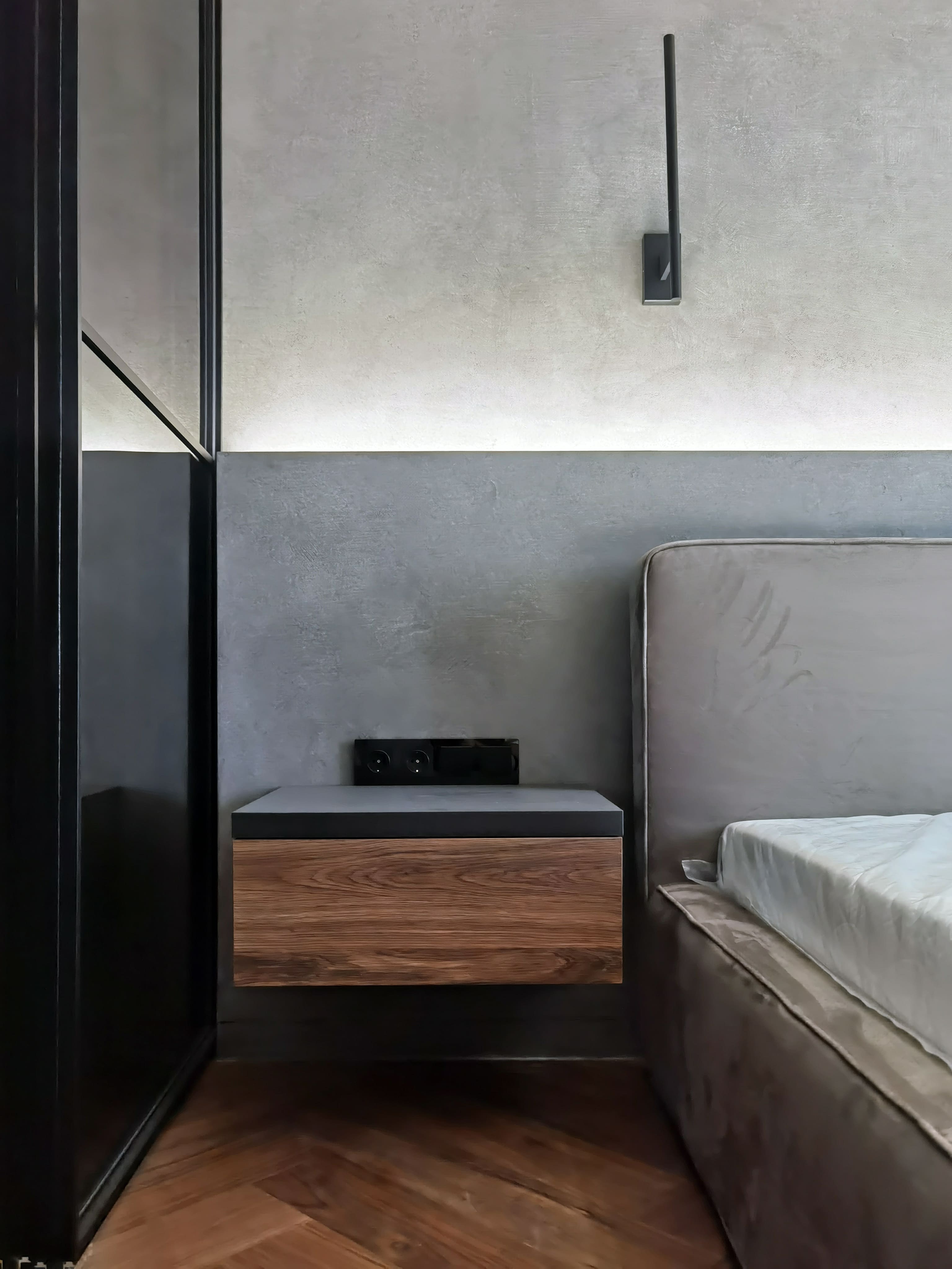 Realization of brutal apartement decorated with stones and dark wood for young bachelor