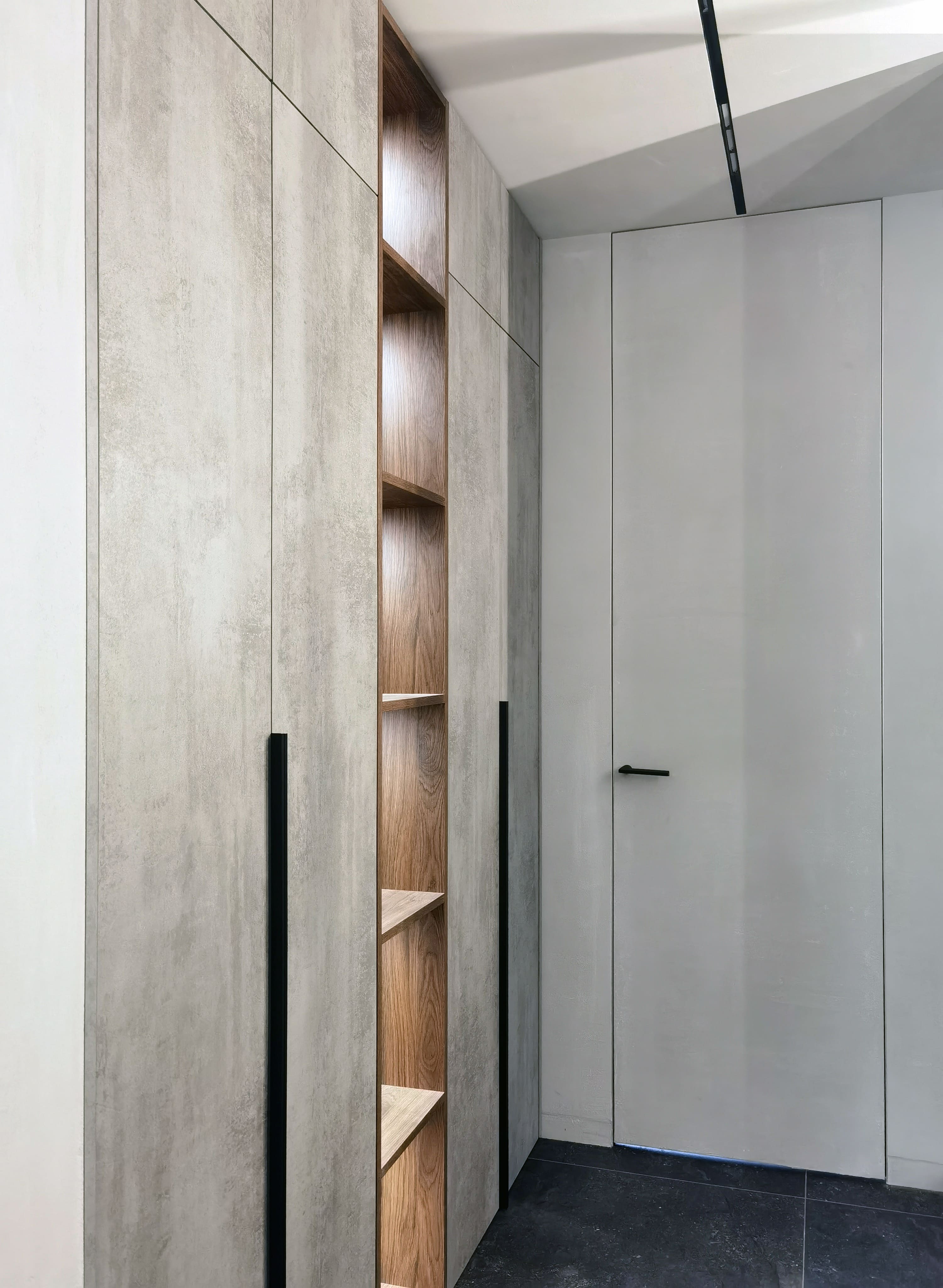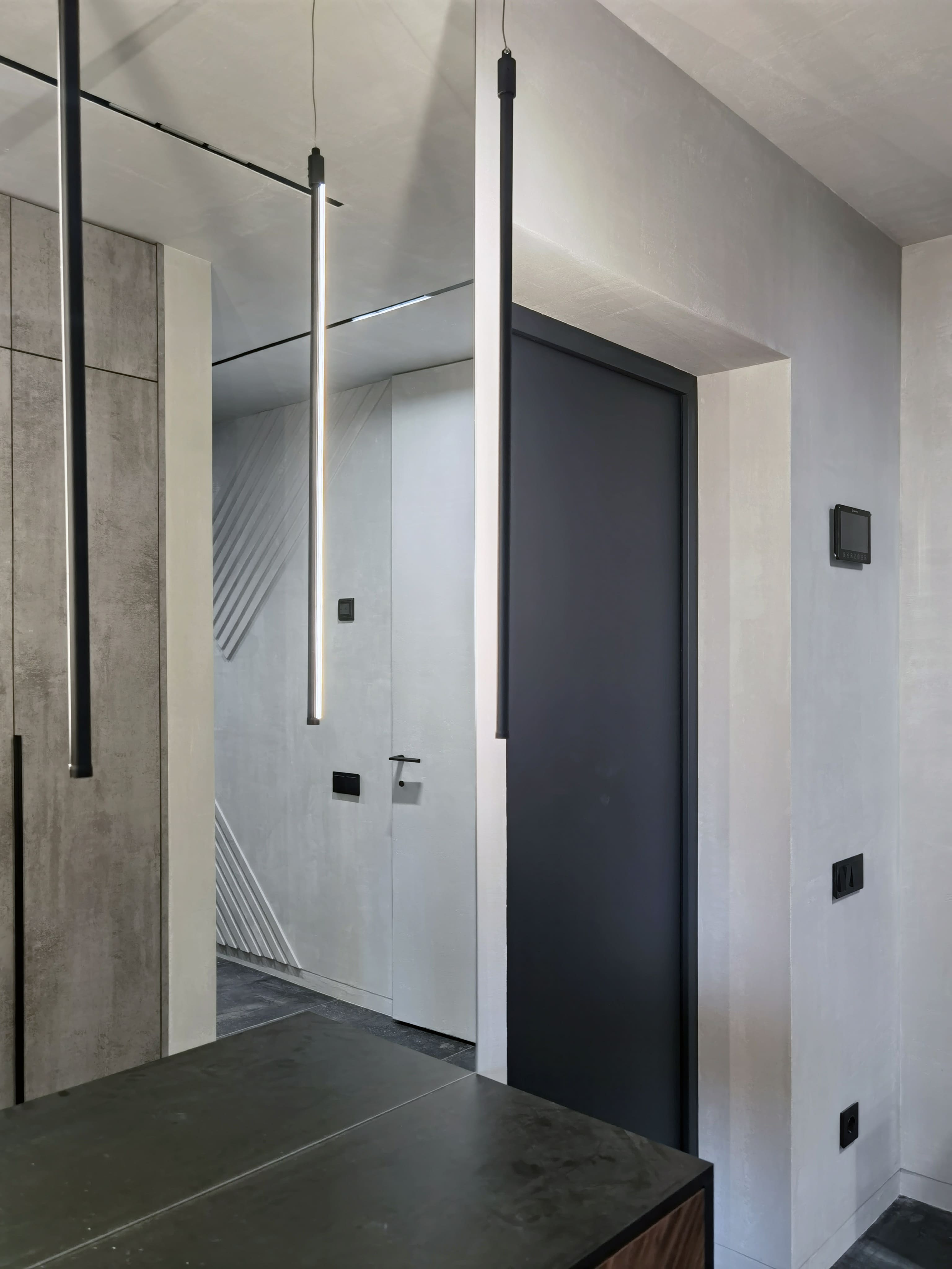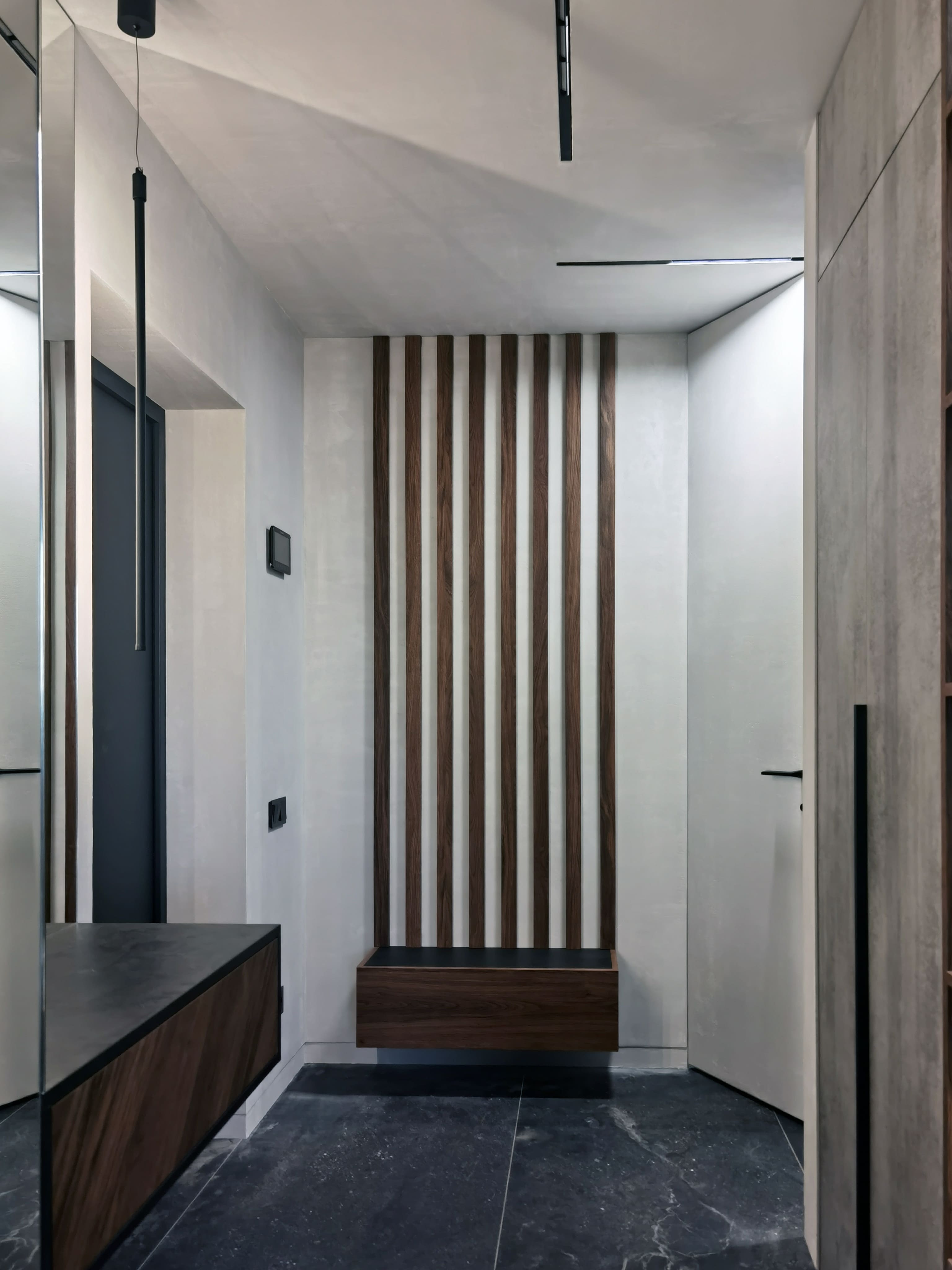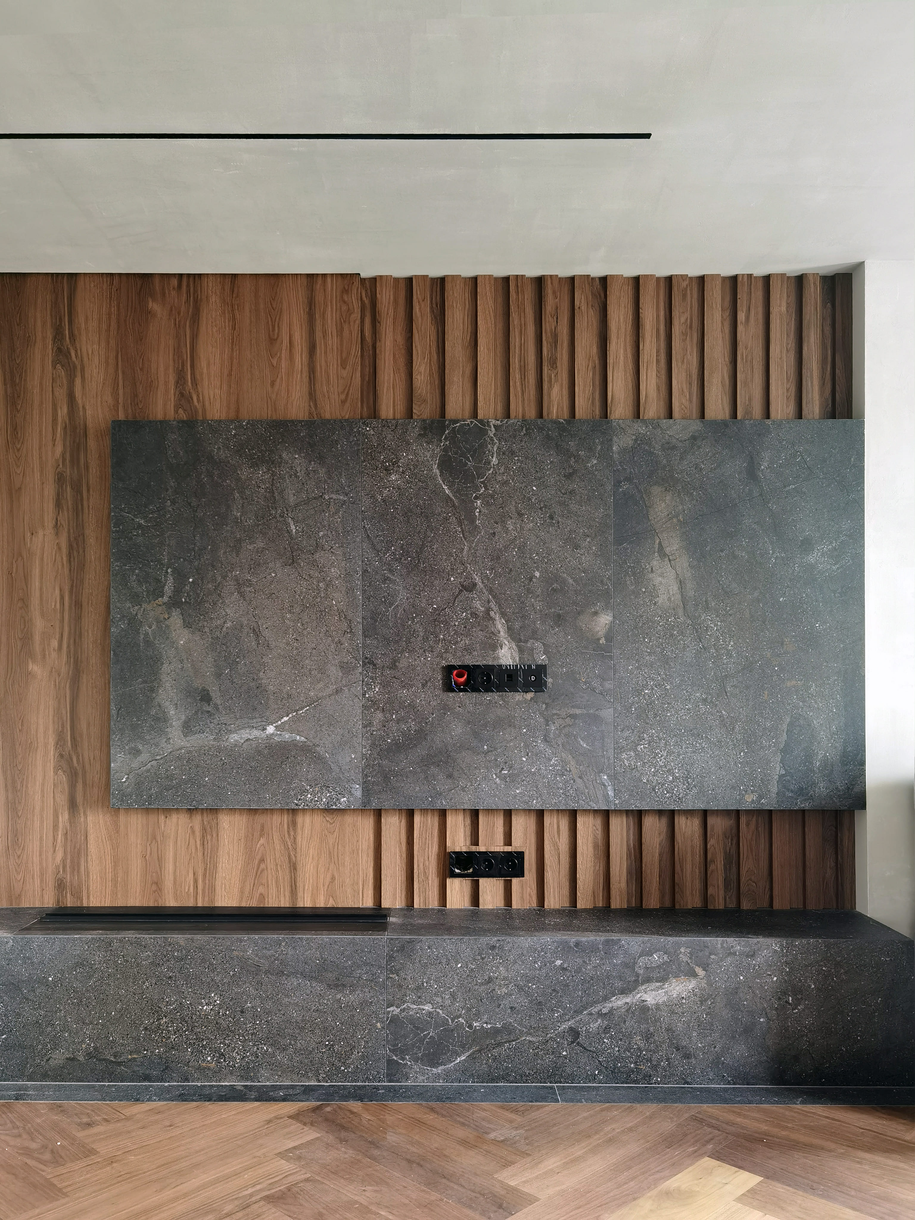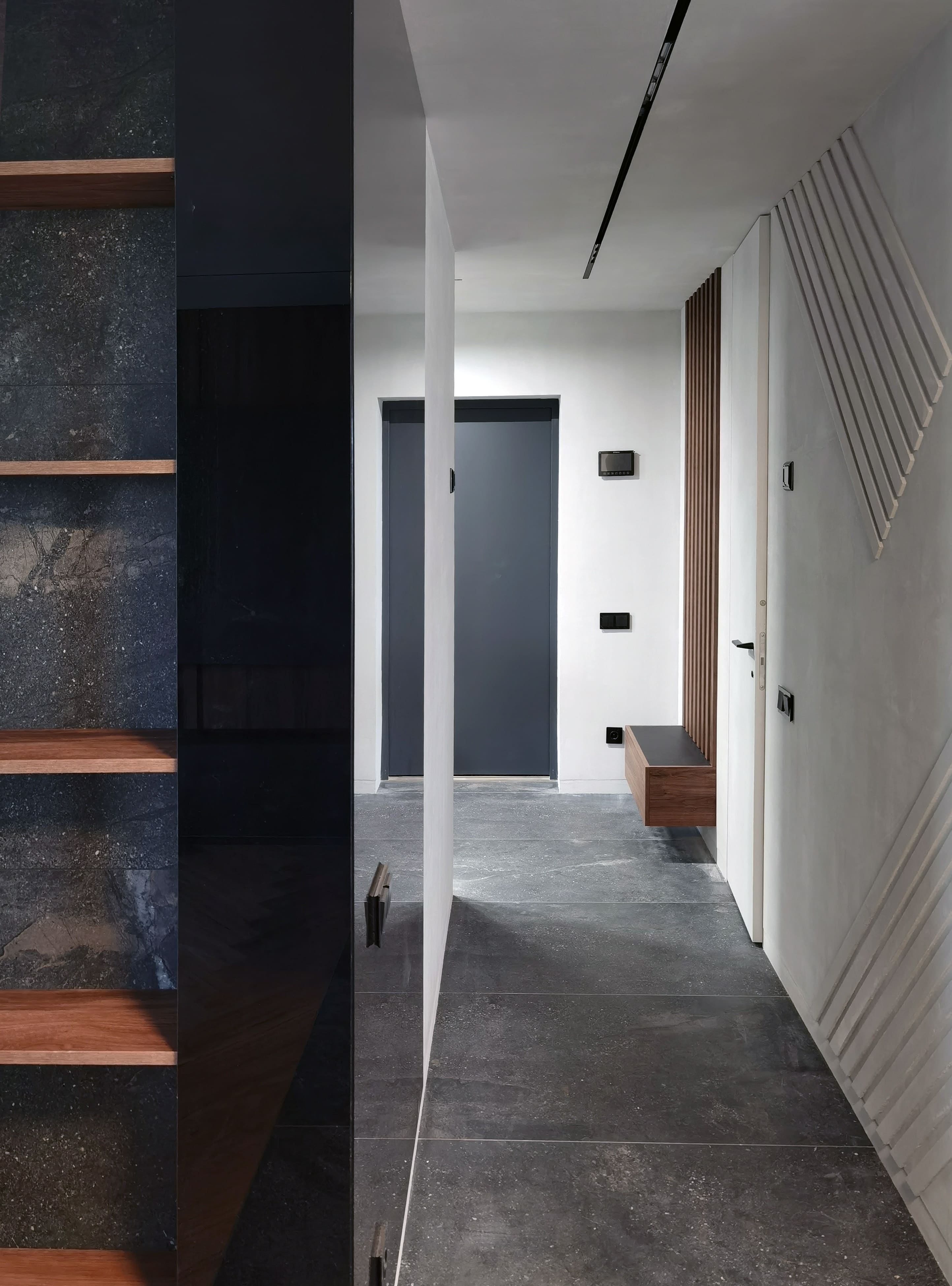 Realization of brutal apartement decorated with stones and dark wood for young bachelor