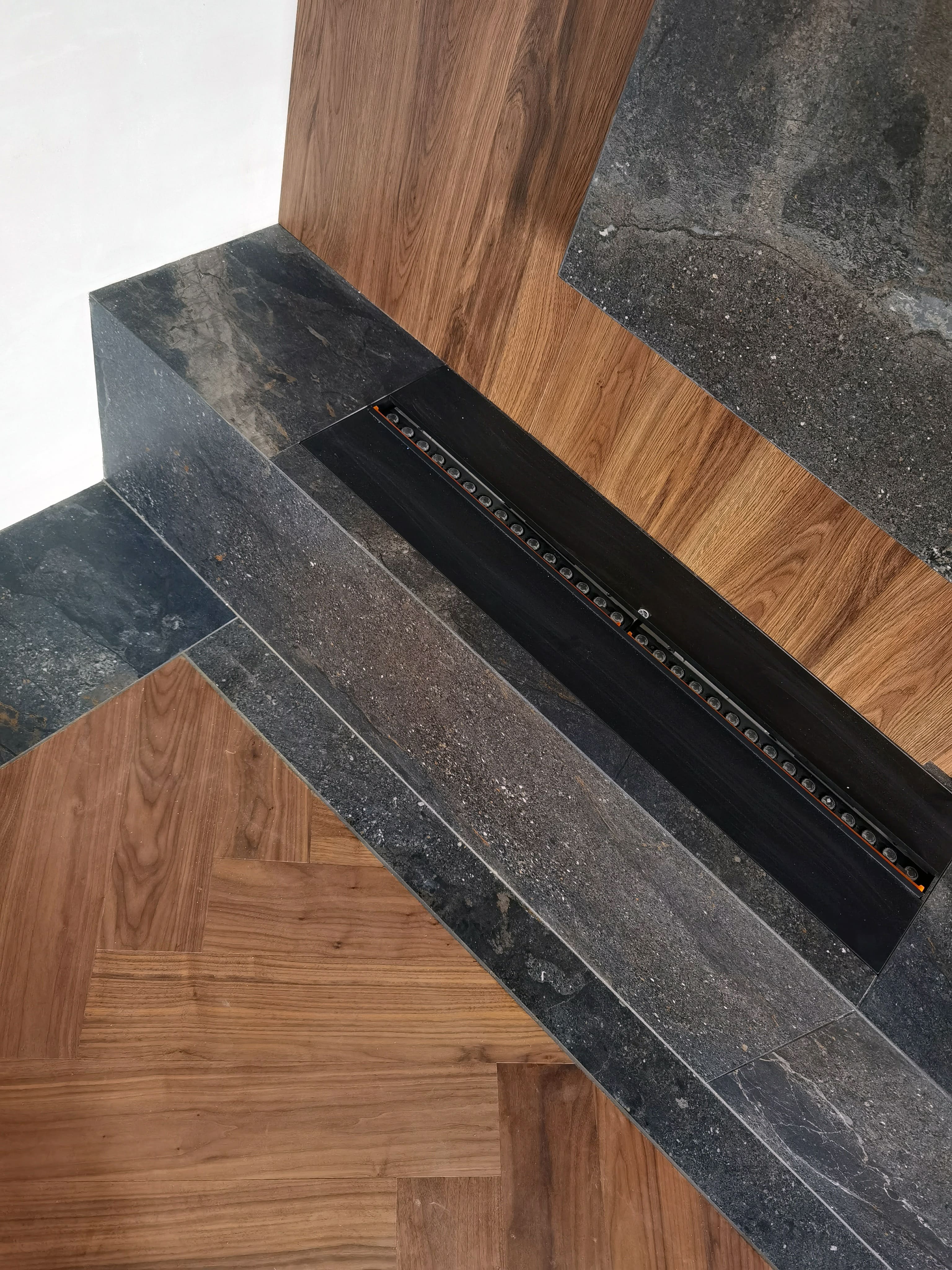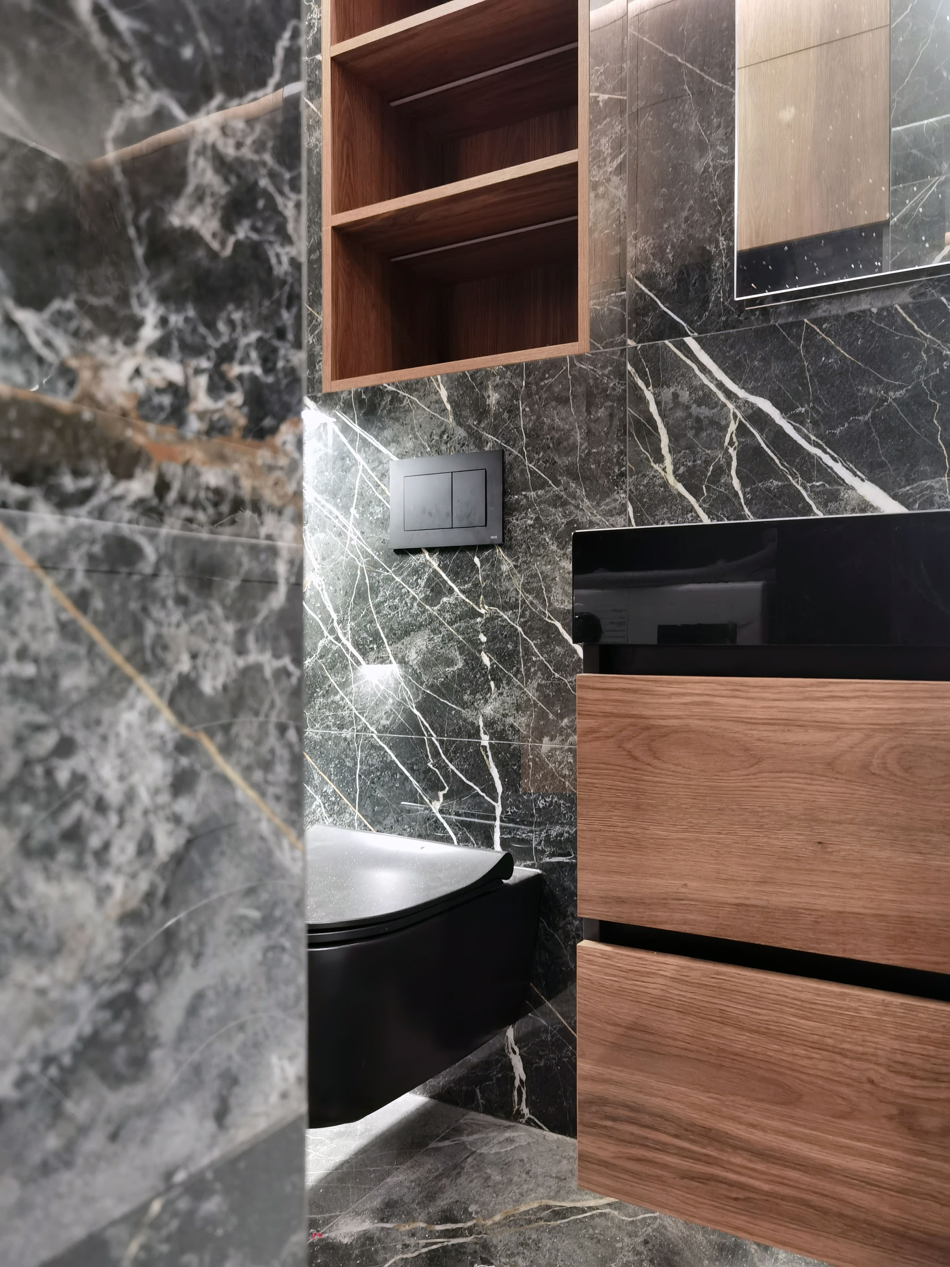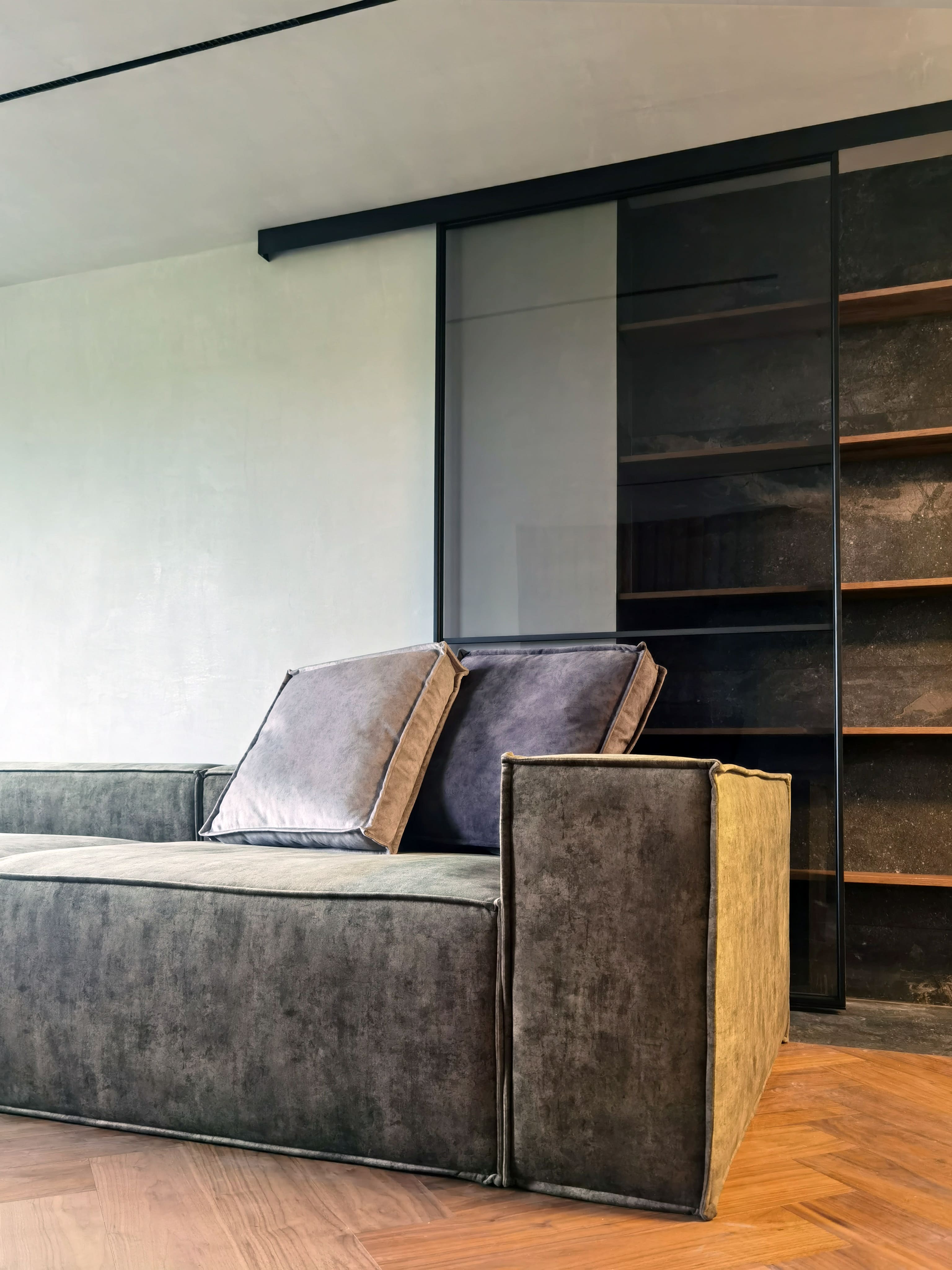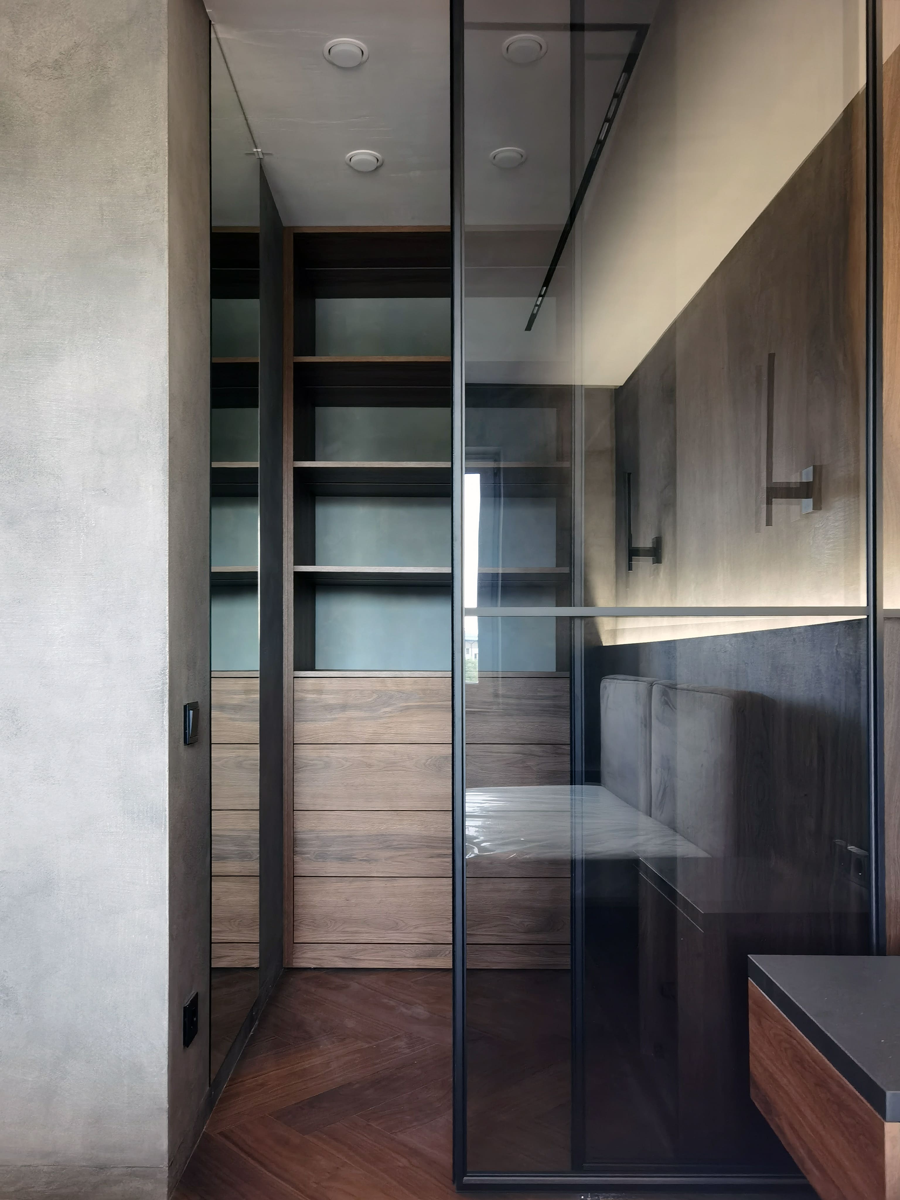 Realization of brutal apartement decorated with stones and dark wood for young bachelor
