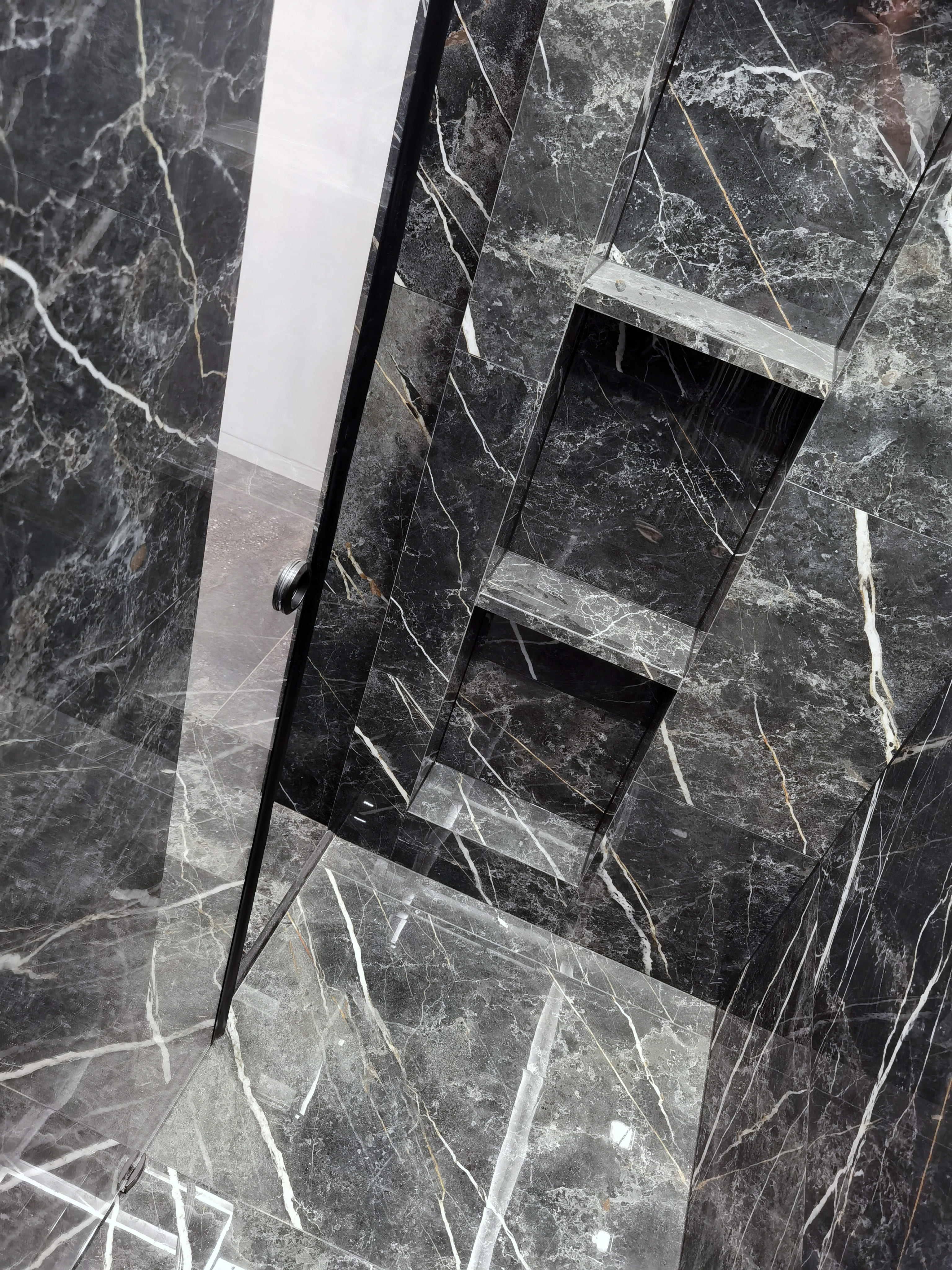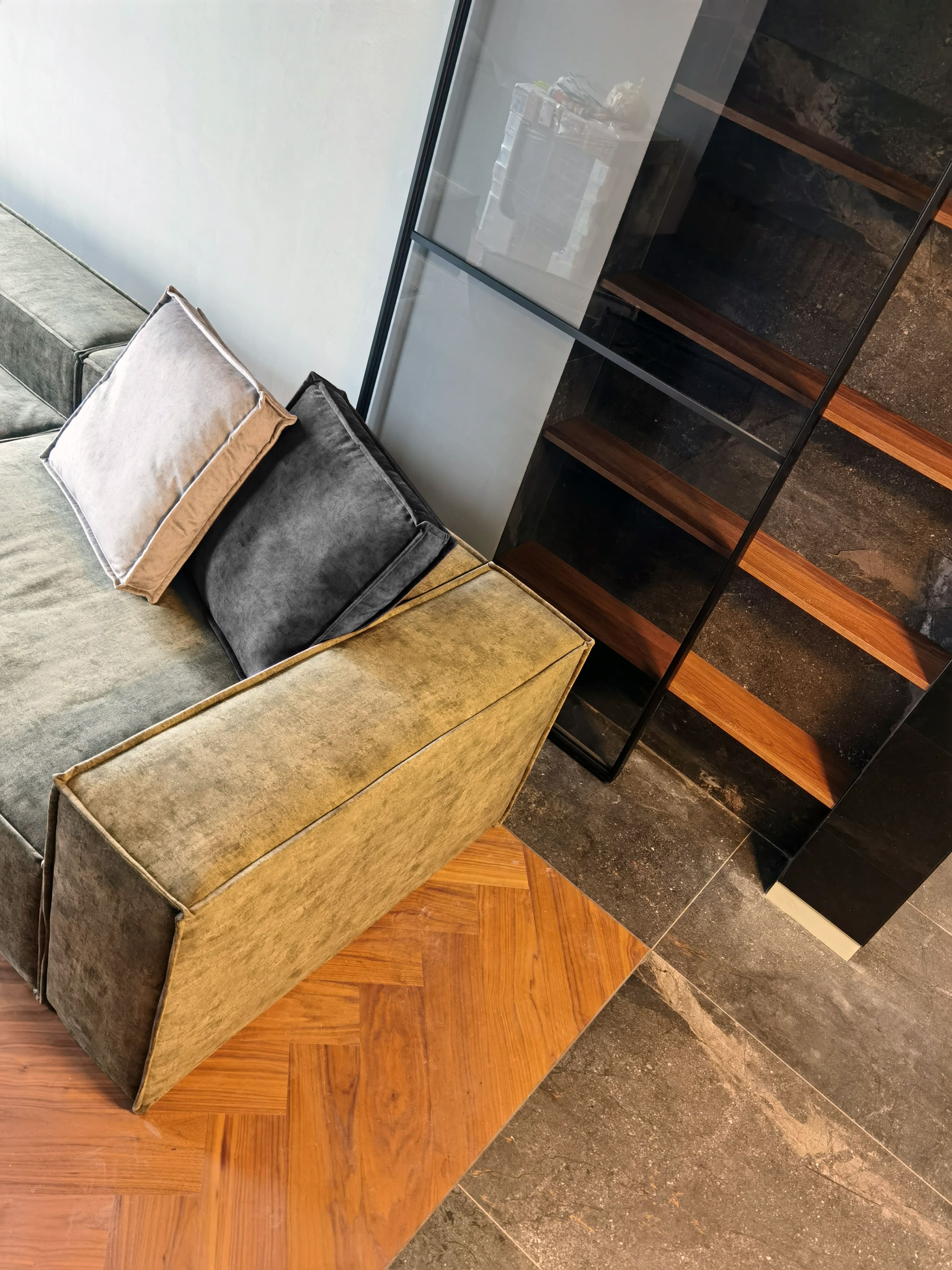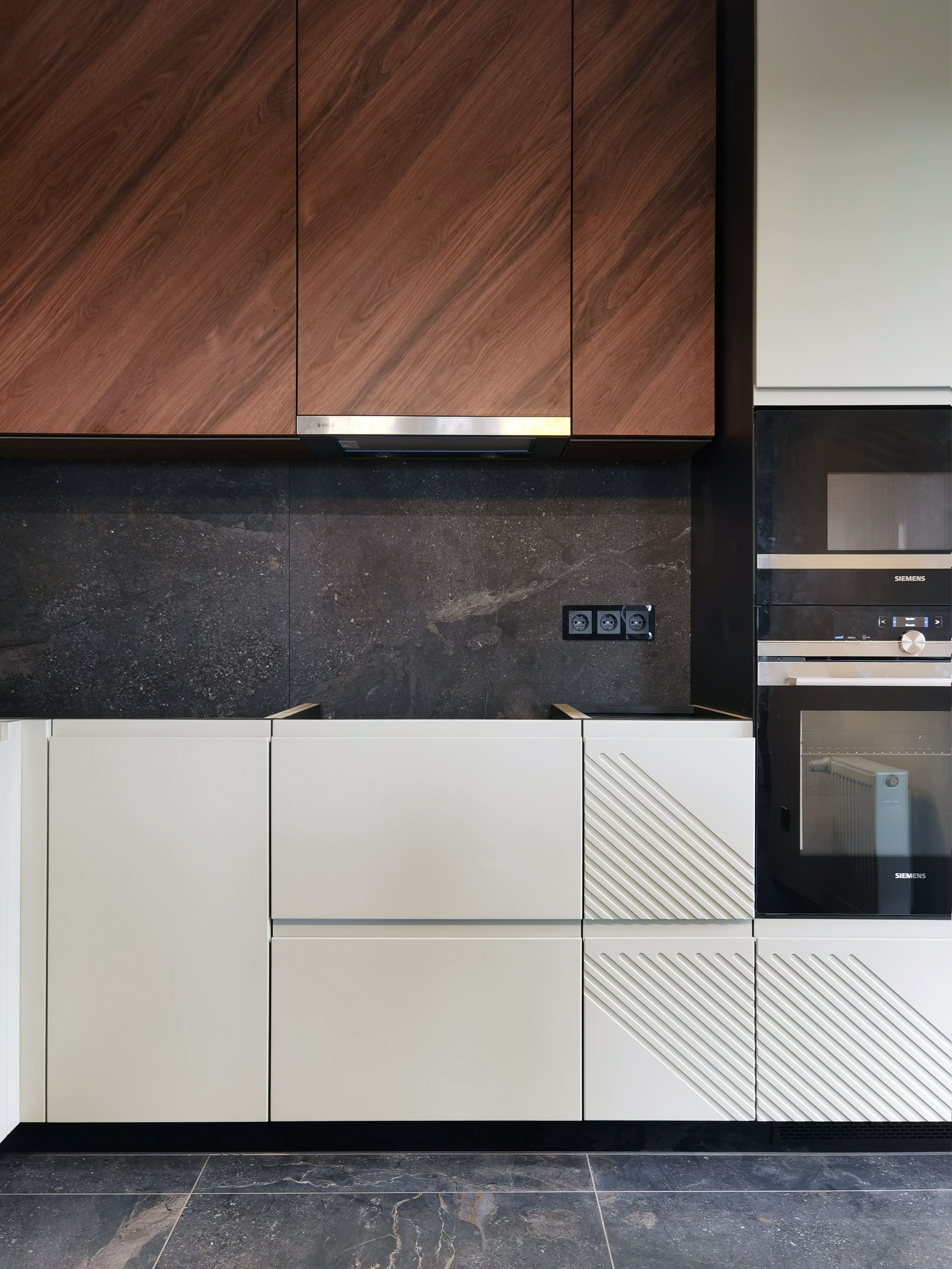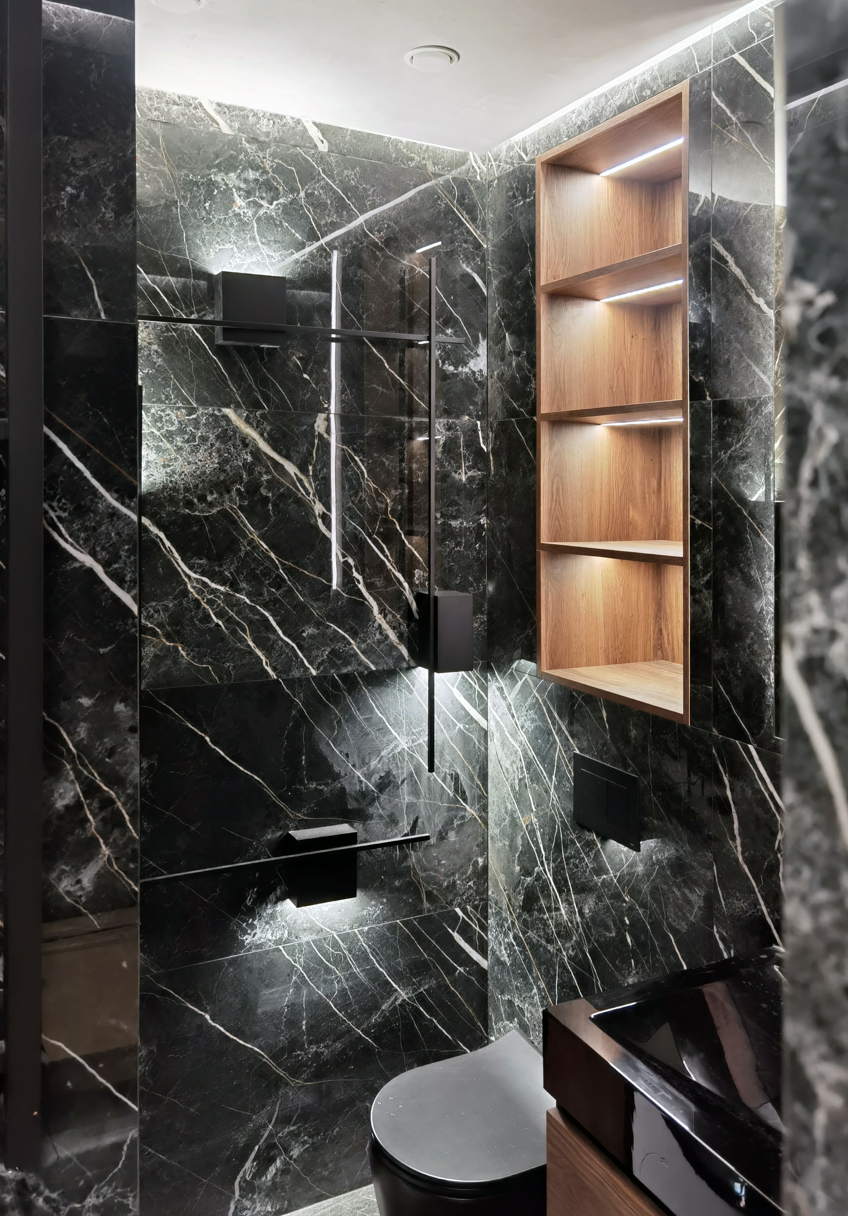 Realization of brutal apartement decorated with stones and dark wood for young bachelor
